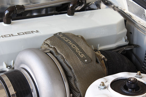 Raceworks Extreme Duty Turbo Beanies, also referred to as Turbo Blankets, are constructed using a high temp titanium outer material, and silica fiber fabric insulation layer interally. The result is a temperature rating of 1000degC.